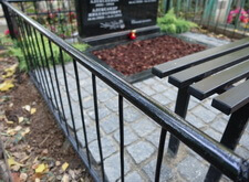 На фото далее окончательный результат работы. В цветнике кора. Надпись на памятнике обработана так, что она уже больше не пропадет в дождь.