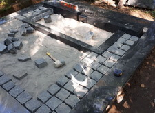 Предварительно застеленную геотекстилем территорию участка засыпаем пескобетонной смесью. На неё крепим основание зеркальных памятников, выставляем общий цветник, укладываем гранитную брусчатку.