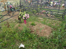 Далее мы перекрасили ограждение, установили подставку, сам памятник, прямоугольный цветник. Работу заканчивали в дождь, поэтому фотографий сухого место захоронения нет. На последнем снимке чётко видно, что даже на мокром памятнике выгравированная надпись очень легко читается.
