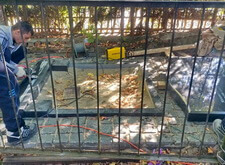 Первый этап работы – очистка и подготовка места захоронения к дальнейшим работам. Мы вынесли памятник, срезали старое ограждение, очистили землю от травы и иного мусора. Далее разметили площадь участка и укрыли её геотекстилем.