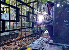 Приносим уже готовую и покрашенную оградку, устанавливаем, свариваем по месту. Параллельно с этим, по дополнительному заказу клиента, устанавливаем по обе стороны от памятника траурные урны, а напротив него – лавочку и две небольшие клумбы с можжевельниками.
