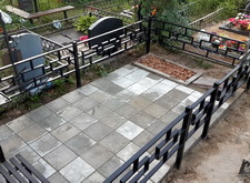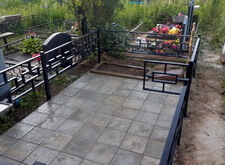 Первое, что мы сделали на могиле – уборку. Тщательно очистив место захоронения от сорной травы и прочего мусора, мы взялись за монтаж ограждения. Ножки оградки вбили в специальные ямы, а по нижней её части проварили металлический борт, служащий одновременно и ограничителем для плитки, и дополнительным каркасом, придающим жёсткость самой конструкции.