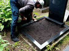 Сметаем с бортов цветника лишнюю землю, после чего переходим к самим надгробьям: вытираем памятники, немного проявляя надписи на их поверхности. Параллельно с этим протираем цветники, окончательно удаляя рассыпанную в процессе посадки землю.
